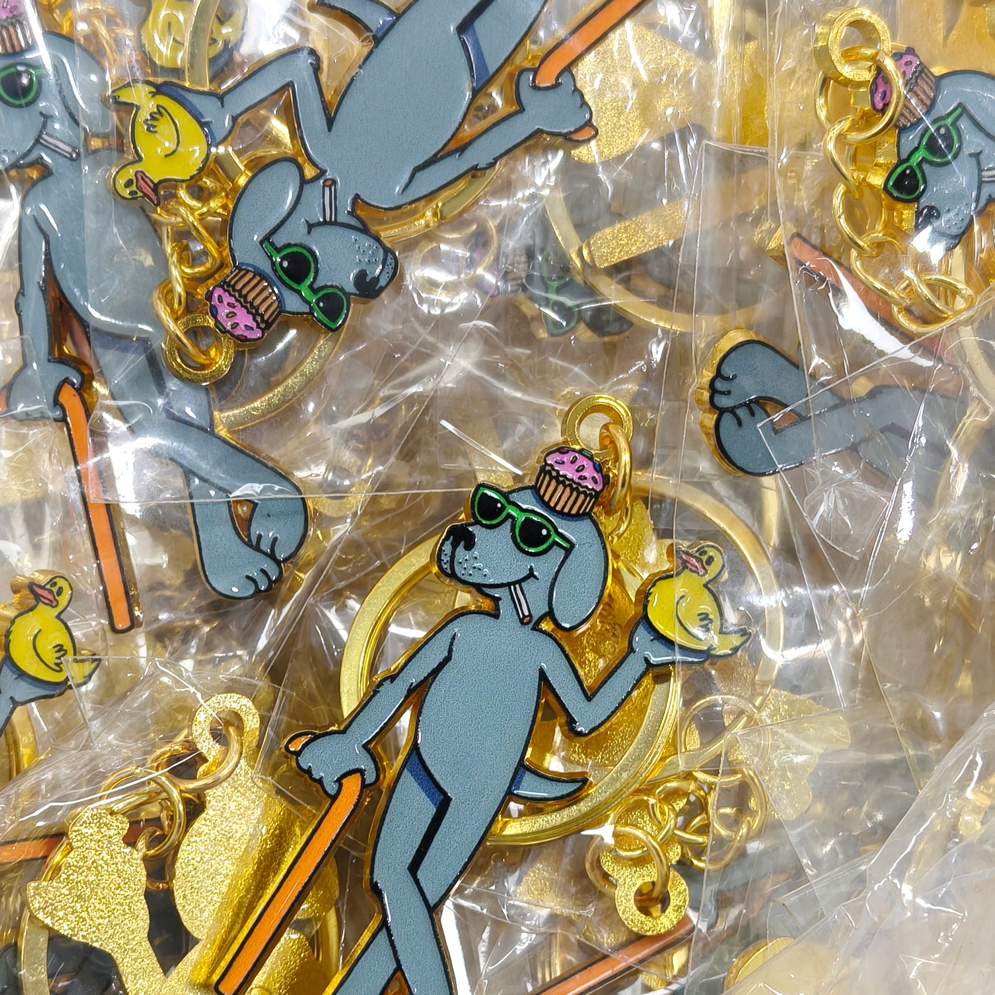 Carry a little Detroit magic everywhere you go. This enamel Clyde keychain features our iconic blue dog in full vibe mode: sunglasses on, cupcake proudly perched, duck in one hand, cane in the other, puffing on a fatty.
